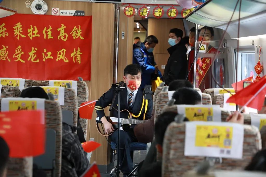12月6日8时58分,随着一声悠长的汽笛声划破长空,牡佳高铁D8857次首发列车缓缓驶出牡丹江站,直奔终点佳木斯。车厢内,哈尔滨局集团公司牡丹江客运段的乘务员们为旅客献上了精彩的文艺节目,旅客立即被现场的气氛感染,纷纷举起手机记录下这一难忘的时刻。