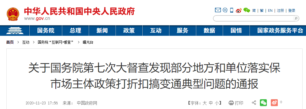 从督查情况看,今年以来,各地认真贯彻落实国家实施的减税降费、减租降息等助企纾困政策,为保住市场主体、稳住经济基本盘提供了重要支撑。但督查组核查发现,部分地方和单位仍存在落实保市场主体政策打折扣、搞变通,推进工作虚落实、假落实等问题,影响了政策红利的充分释放。按照2020年11月11日国务院常务会议部署要求,现将有关典型问题通报如下。 按照清理拖欠民营企业中小企业账款的工作要求,2020年底前无分歧欠款应清尽清,存在分歧的也要通过调解、协商、司法等途径加快解决,决不允许增加新的拖欠。但督查发现,一些地方和单位仍存在拖延还款时间、虚报还款金额、瞒报漏报拖欠账款、边清边欠等问题。 陕西省部分单位瞒报漏报拖欠民营企业中小企业账款、违规新增欠款、虚报偿还金额。西安市统一建设管理办公室瞒报漏报拖欠36家民营企业账款1.97亿元; 陕西警官职业学院瞒报漏报拖欠21家民营企业工程款3046.4万元; 韩城市原城市管理工作局(现城市住房和城乡建设局)、商洛市商州区分别瞒报漏报拖欠浙江人文园林公司工程款1亿元、4836.84万元; 西安市沣惠渠管理中心违规新增拖欠陕西金桥建设有限公司账款207.44万元,上述账款均未纳入清欠台账; 延安市延川县有关部门截至去年底上报完成清欠民营企业中小企业账款12.03亿元,实际仅偿还6.95亿元,虚报偿还金额5.08亿元。
